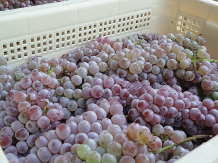 現在クレーレは搾汁も終了し、一両日中には発酵が終了、その後ラッキング(澱引き)をしてMLFのスタートです。次に8月30日、シャルドネの収穫!今年は1450kgの収量で果汁の糖度は19.6で酸度は7.7でした。甲府市では酸の減退が早いので酸度に注目し収穫日を決定。また晩腐病らしき果粒が発見されたため被害被害が拡大する前に収穫し健全状態の果実で仕込を行うことができました。