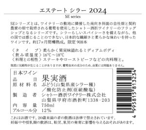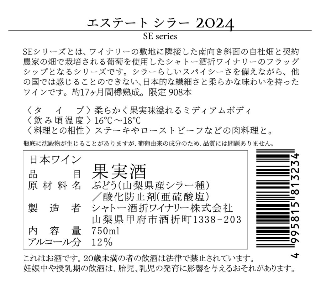 コメント 色調は淡くややオレンジがかったルビー色です。トップにシラー特有のスパイシーなアロマを感じられ、ベリー系果実やスミレの花を思わせる華やかな香りが広がります。次第に甘草などのハーブの香りが徐々に現れます。豊かな果実味と程よい酸味を感じられる柔らかな口当たりです。余韻には穏やかなタンニンと果実感が心地よく続きます。オーストラリアのシラーズと比べると、タンニンは控えめで日本らしい繊細でエレガントなワインに仕上がっています。