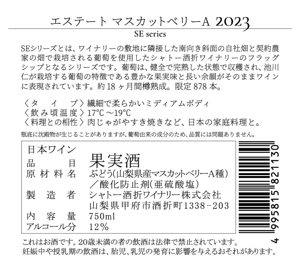 ワイナリーすぐ横にある自社畑で収穫されたマスカットベリーA種で造られたワイン。口に含むとベリー系の果実の風味がボリュームをもって感じられ、アフターにはほど良いタンニンが残ります。