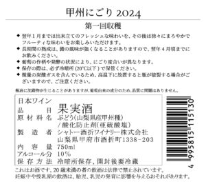 第一回収穫は甲府・笛吹地区、そして南アルプス地区で収穫された葡萄を中心に使用した、甘味が多く苦味の少ない、バランスの良いフルーティな味わいです。普段ワインを飲み慣れていない方にも楽しんでいただきやすいワインです。