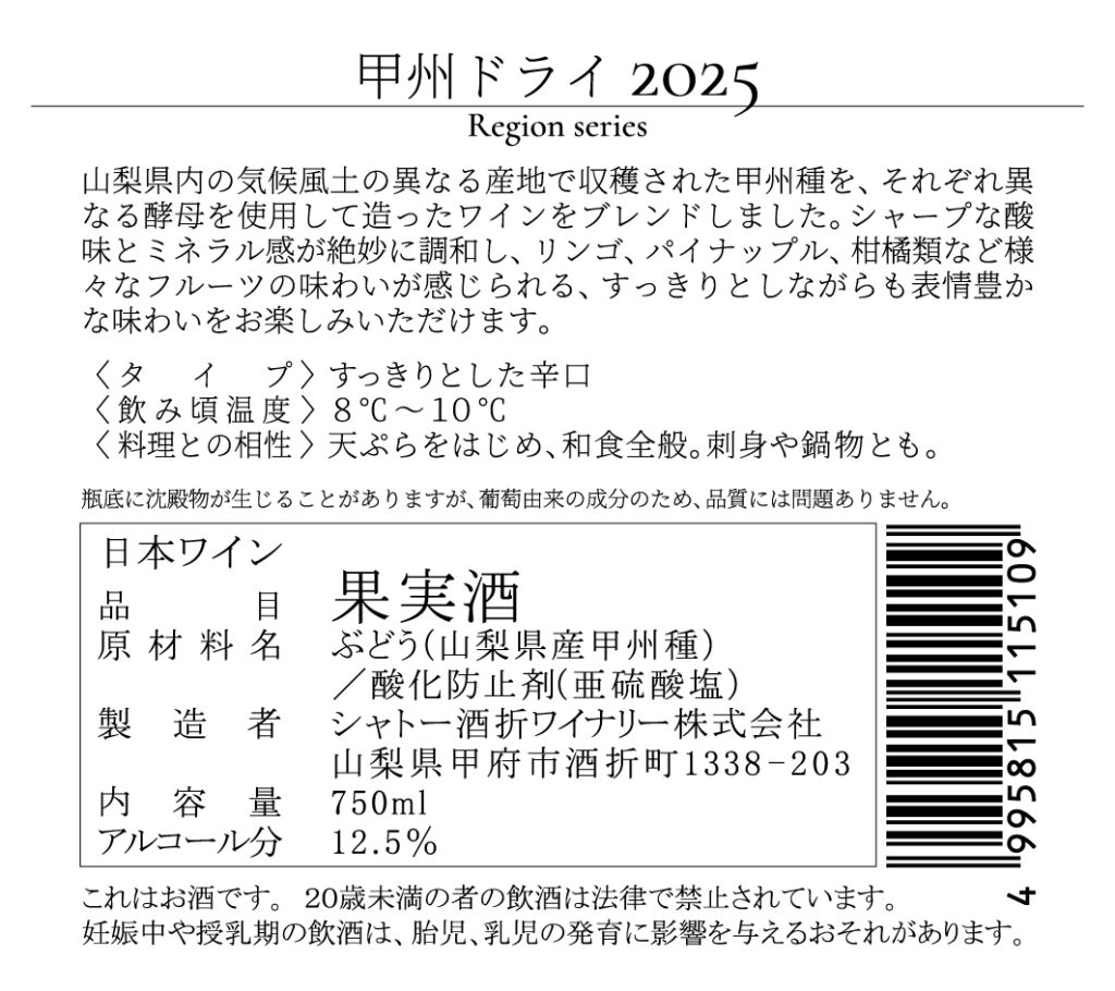 甲州ドライは、山梨県内のさまざまな地域の甲州ブドウをブレンドしたワインです。2025年のブレンド比率は穂坂地区42%、甲府地区30%、一宮地区18%、山梨地区10%で、搾汁率は約79%です。